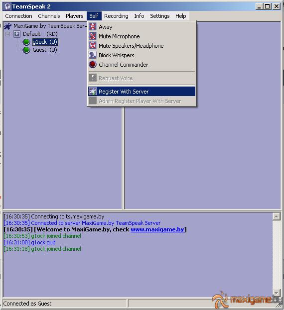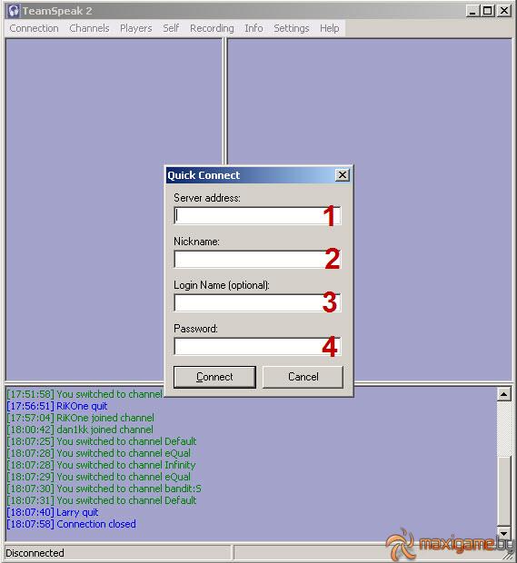 В первом поле вводите адрес сервера ts.maxigame.by Во втором окошке тот ник, под которым вас увидят пользователи. В третьем окне вводите свой логин в том случае, если вы уже зарегистрированы на сервере! В последнем окне вводите пароль сервера maxigame, если еще не зарегистрированы. Если зарегистрированы, то вводите пароль от своего аккаунта.